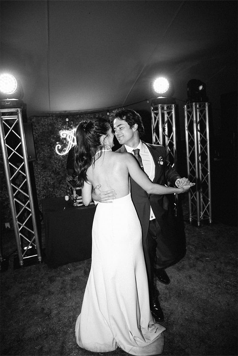 A woman in a flowing white dress stands gracefully amidst lush greenery