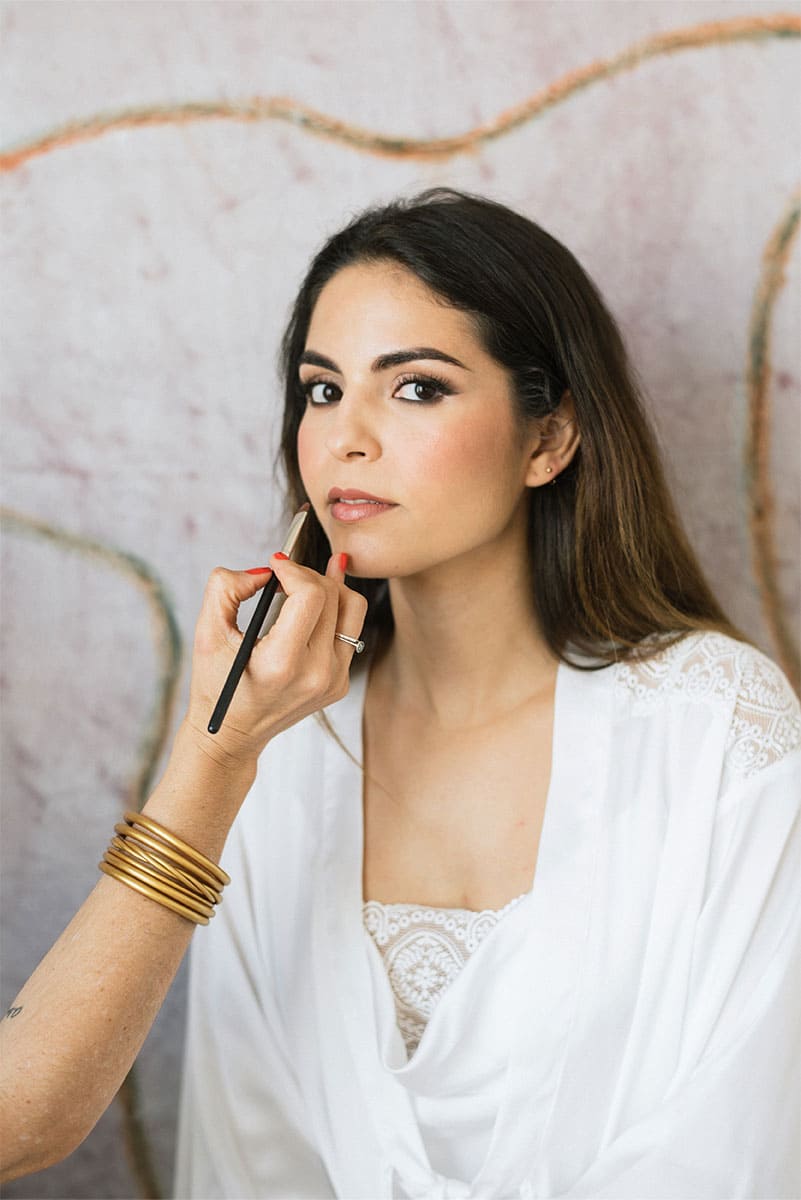 A woman applies makeup with precision, wearing a lace-trimmed robe and gold bangles