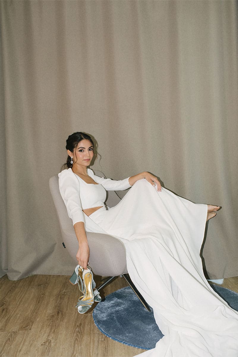 A woman in a flowing white dress sits elegantly on a modern chair
