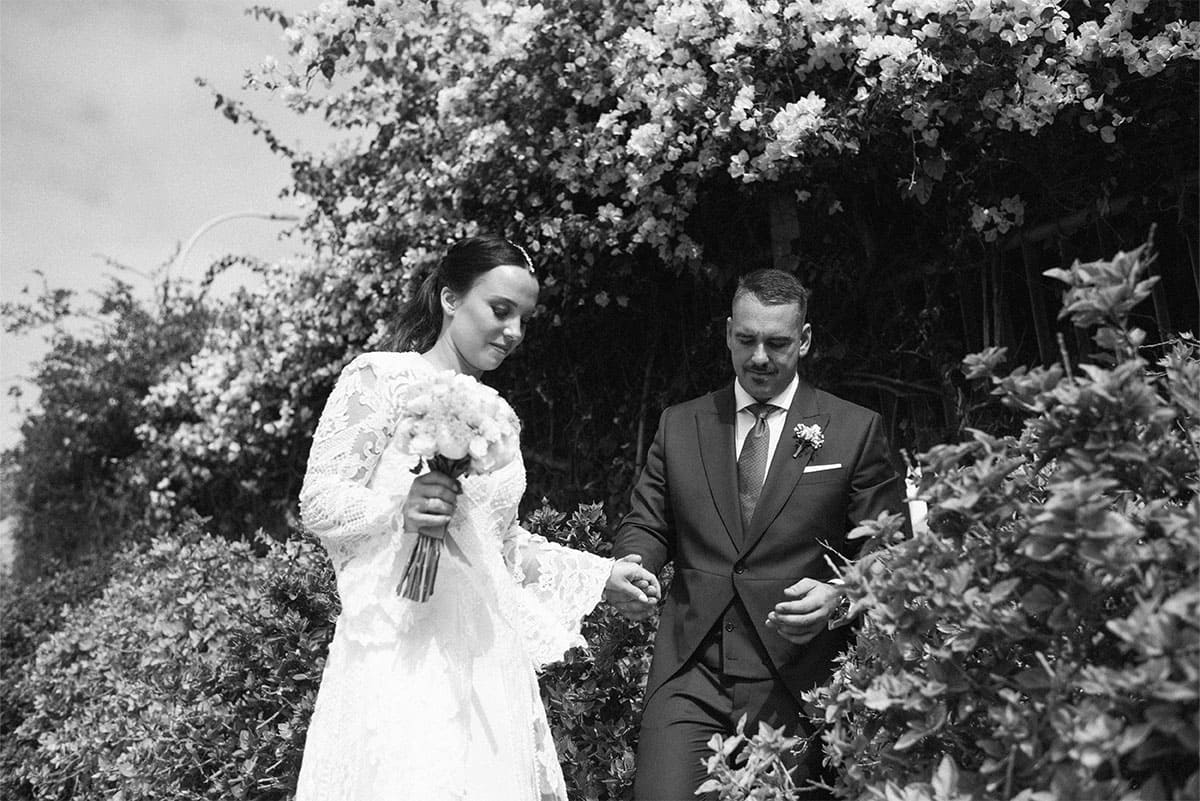 Bride and groom walk hand in hand through lush greenery