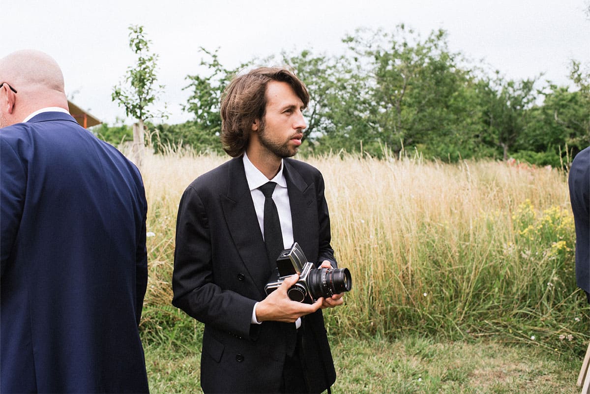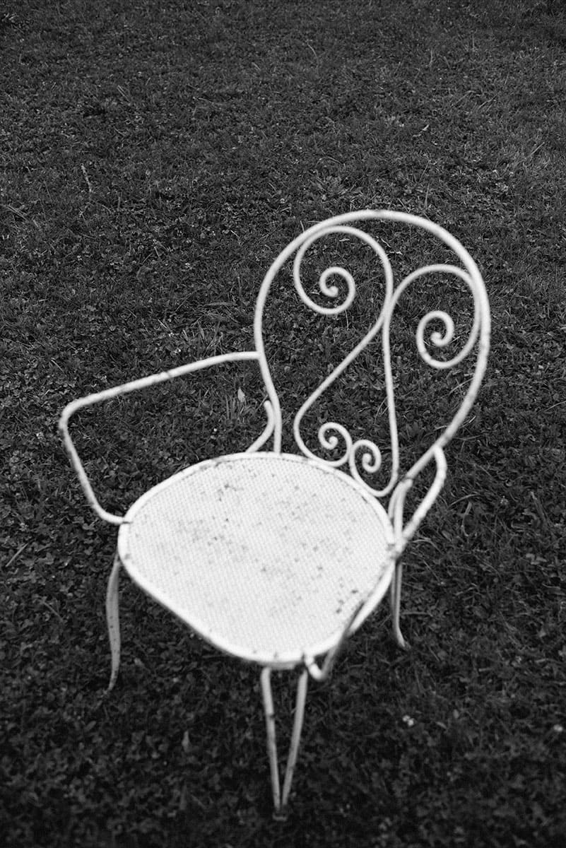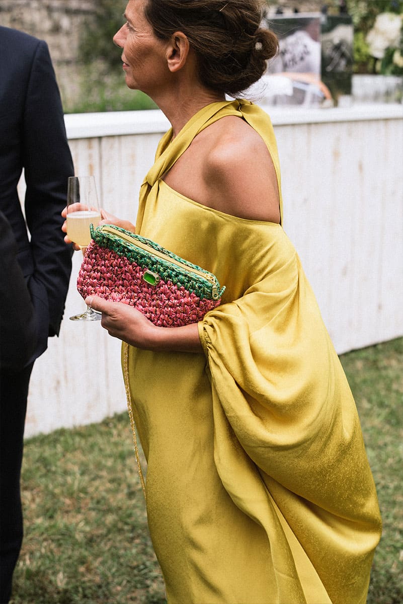 A woman in a flowing white dress stands gracefully amidst lush greenery