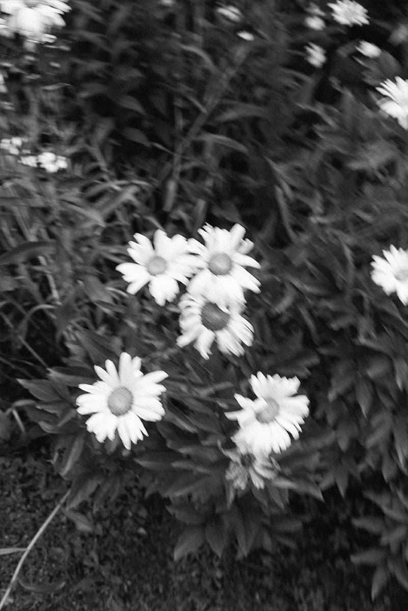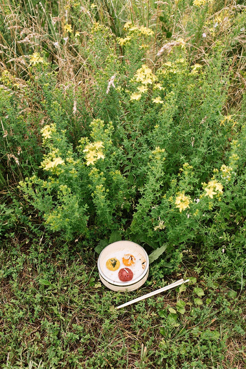 A bowl of colorful food is placed on the grass surrounded by wildflowers and greenery