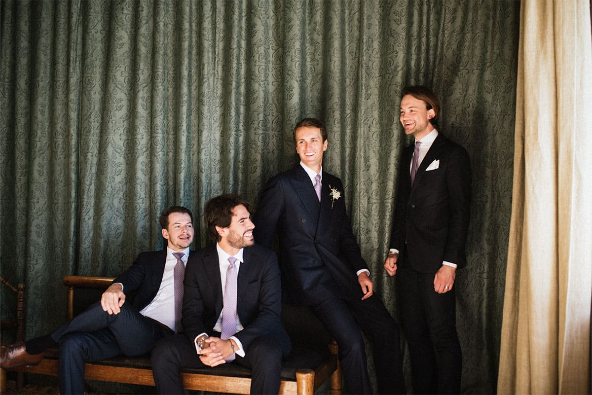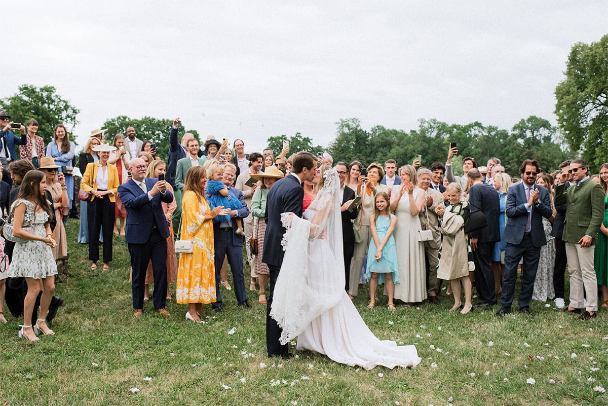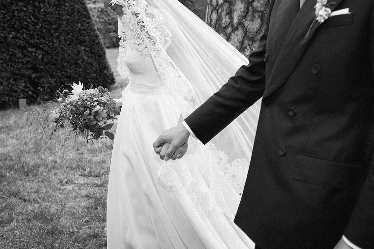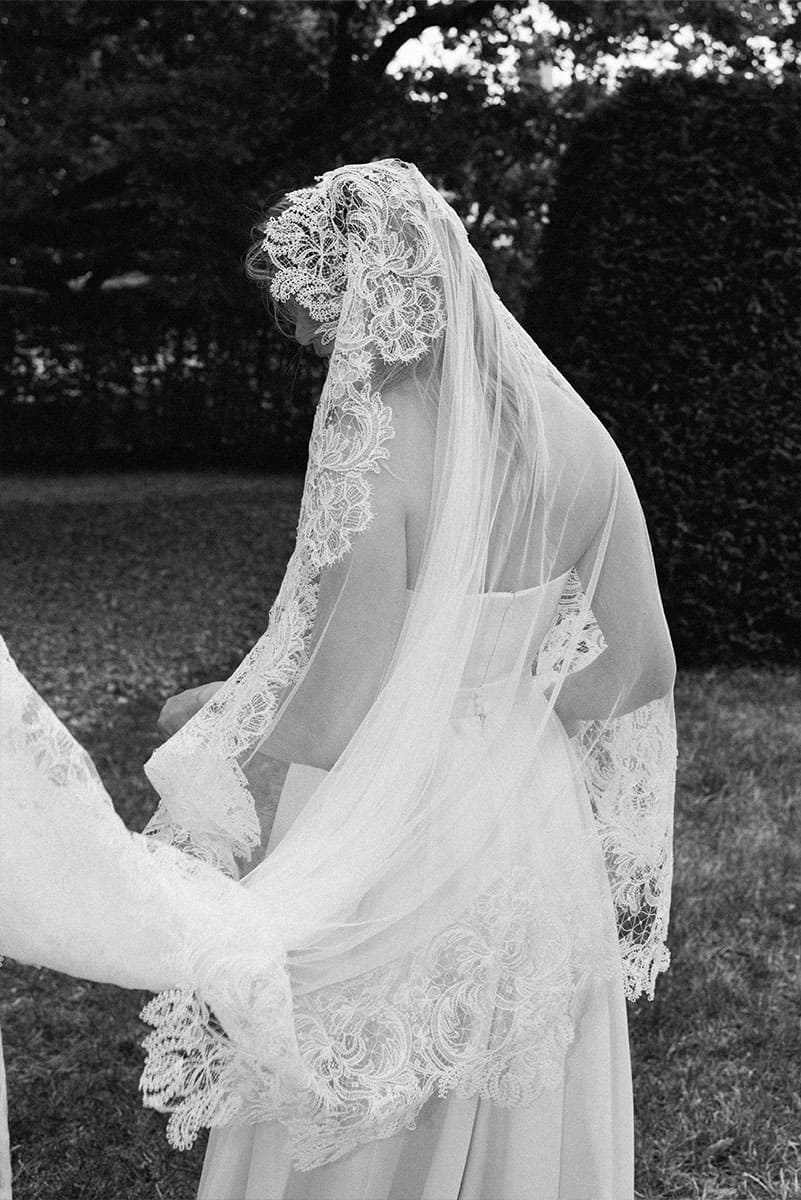 The bride stands gracefully in a white wedding gown with a delicate lace veil