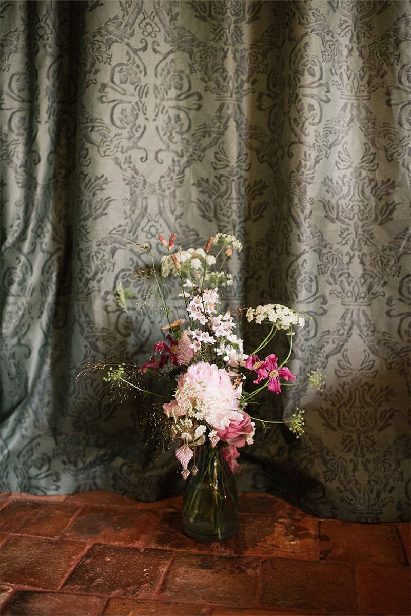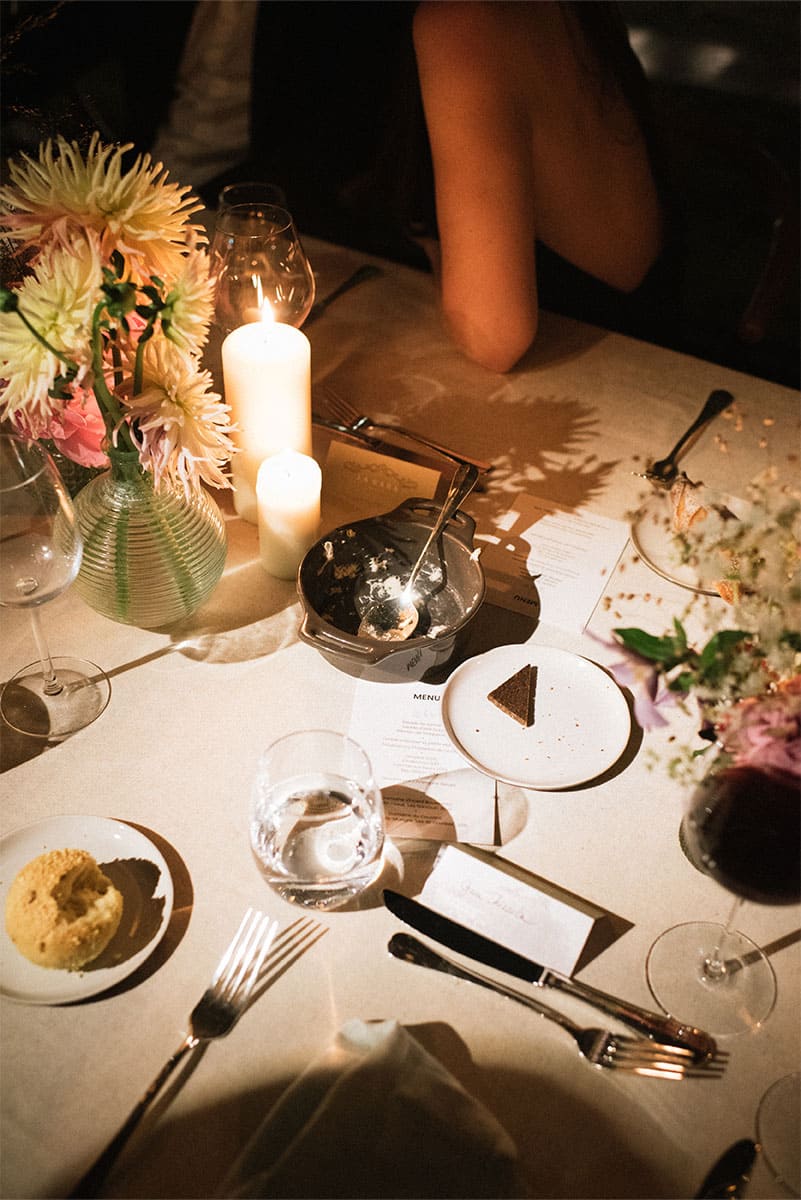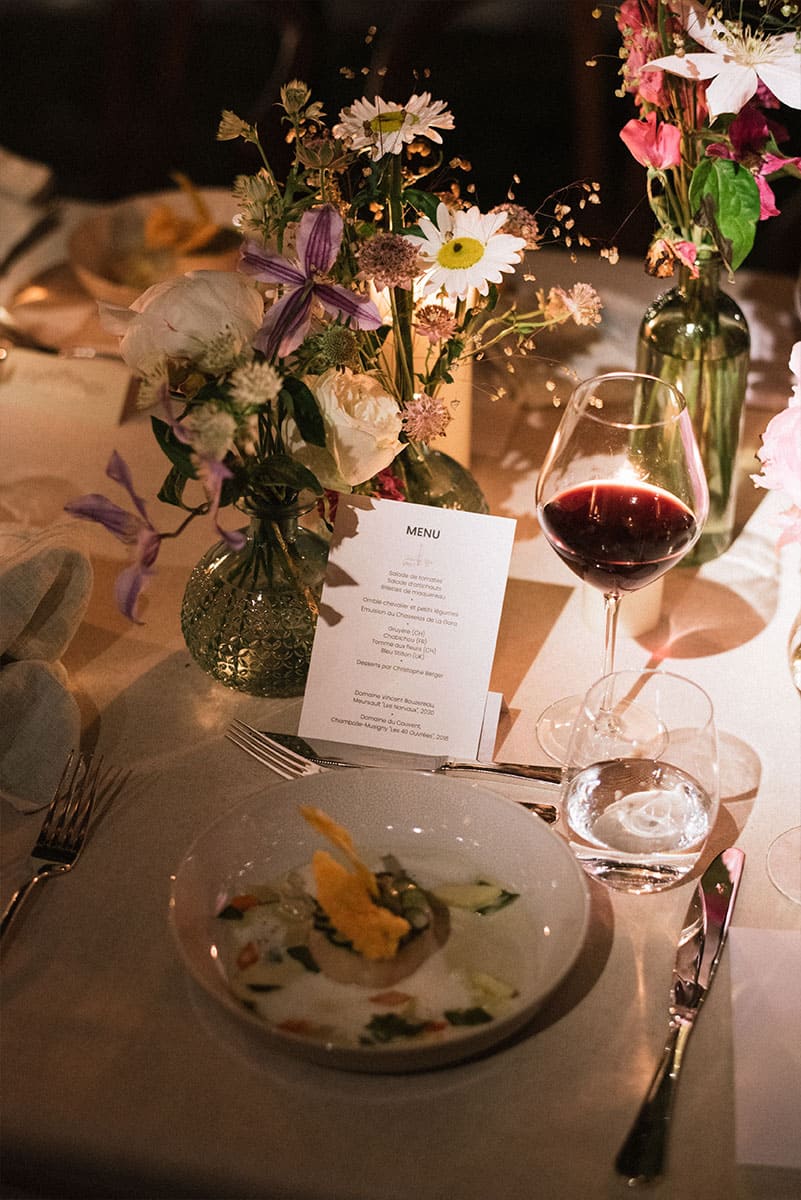 An elegantly set dining table featuring fresh flowers, a wine glass filled with red wine