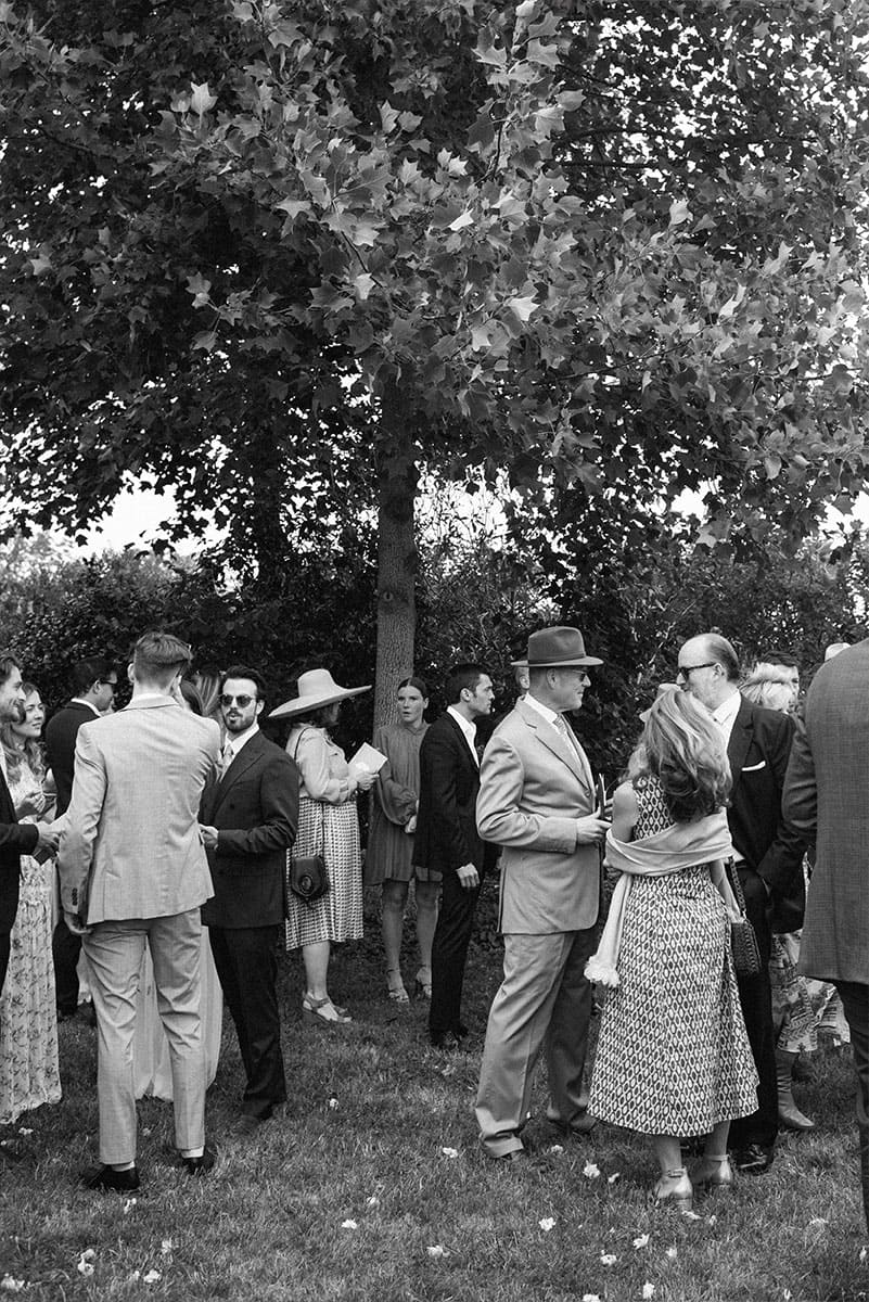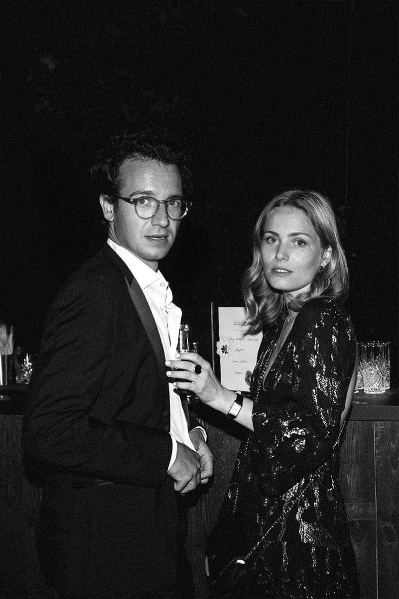 A stylish couple at an event, the man in a tuxedo and the woman in a shimmering dress